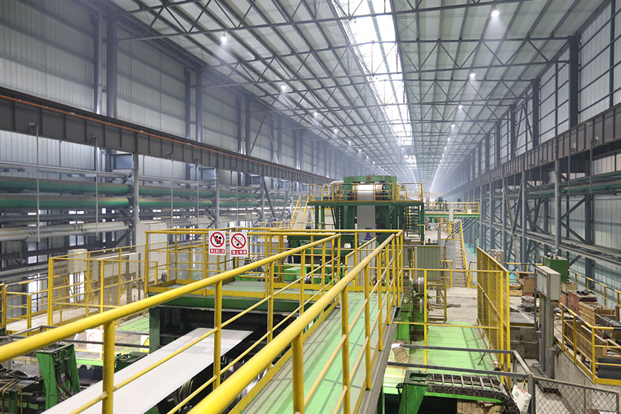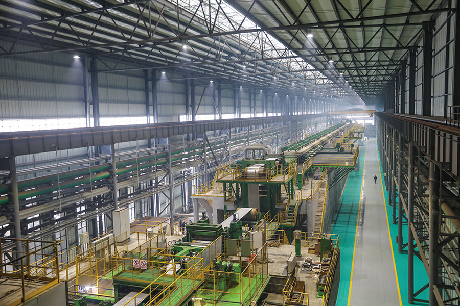 We have introduced a set of 1420 pickling line-tandem cold rolling mill (PL-TCM), which is jointly designed and manufactured by CFHI and WISDR. Electrical part is Shanghai BAOSIGHT’s automatic control system and unit equipment is configured reasonably. The equipment is able to reach domestic first-rate level. Machinery equipment is composed of laser welding equipment, spraying turbulence-flow pickling equipment, high-precision dual-tower cutting equipment (SMS), five-rack channeling roll UCM tandem mill and new-type rotary dual-coiling block coiling machine. Electrical part of rolling mill is designed with second flow control system and key electrical equipment includes laser velocimeter (BETA), thickness gauge (IMS), tension meter (ABB) and shape meter (ABB), all of which can control sheet thickness and shape automatically; rolling speed can reach 1,500 m/min and designed annual output of unit is 1.2 million t. With thickness within 0.2—2.0 mm, the finished product is mainly oriented to household appliance, food, building and auto markets.
