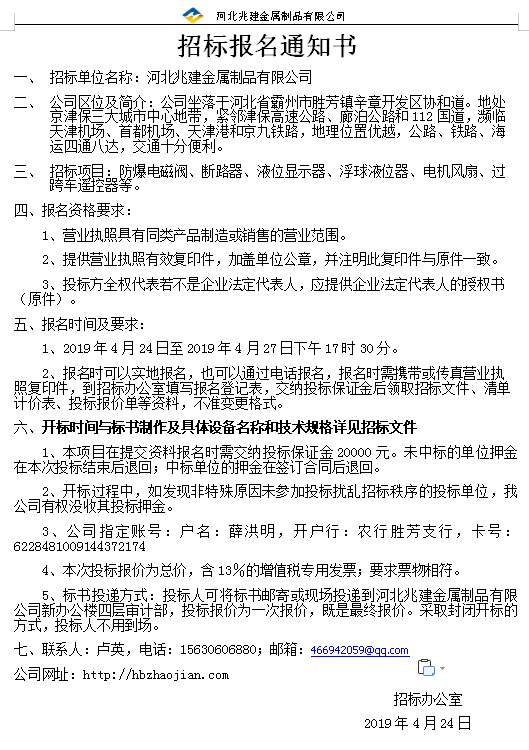 • 招標業主: 河北兆建金屬制品有限公司
