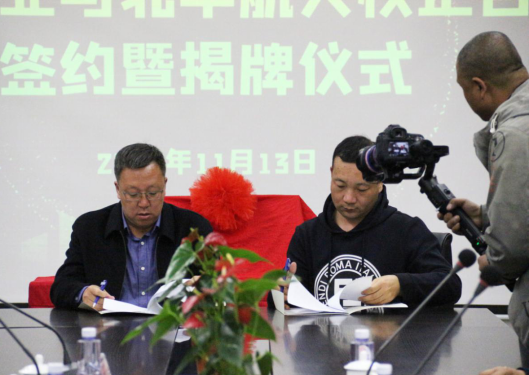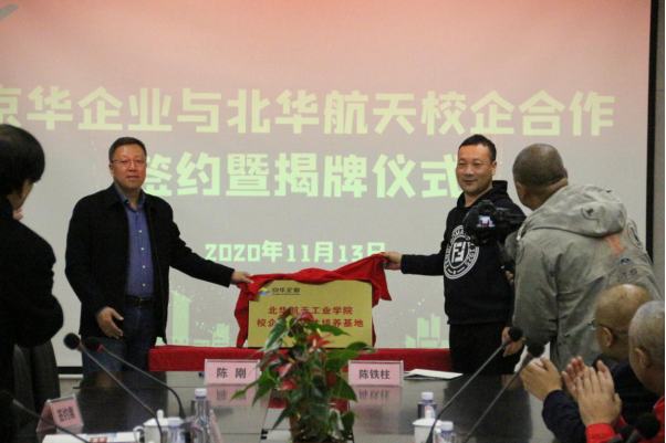 揭牌儀式上,北華航天工業學院校長陳剛、京華企業總經理陳鐵柱一起為此次校企合作揭牌。