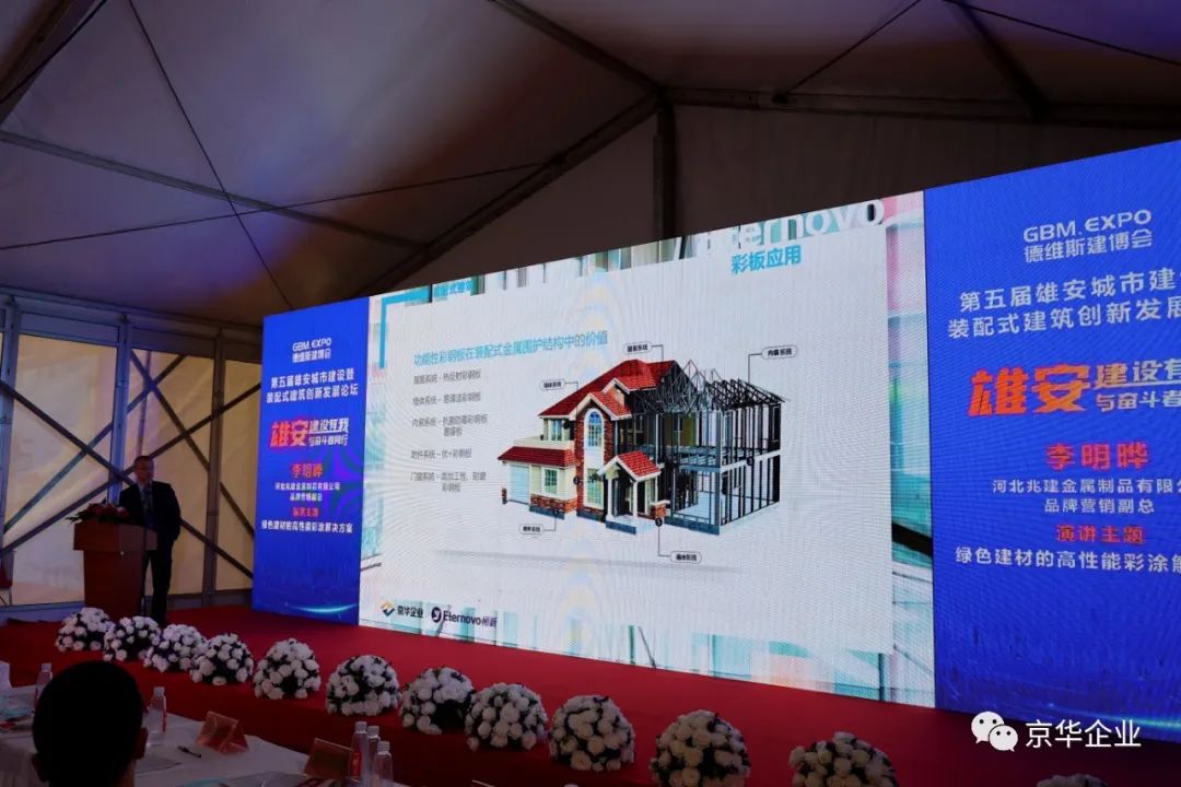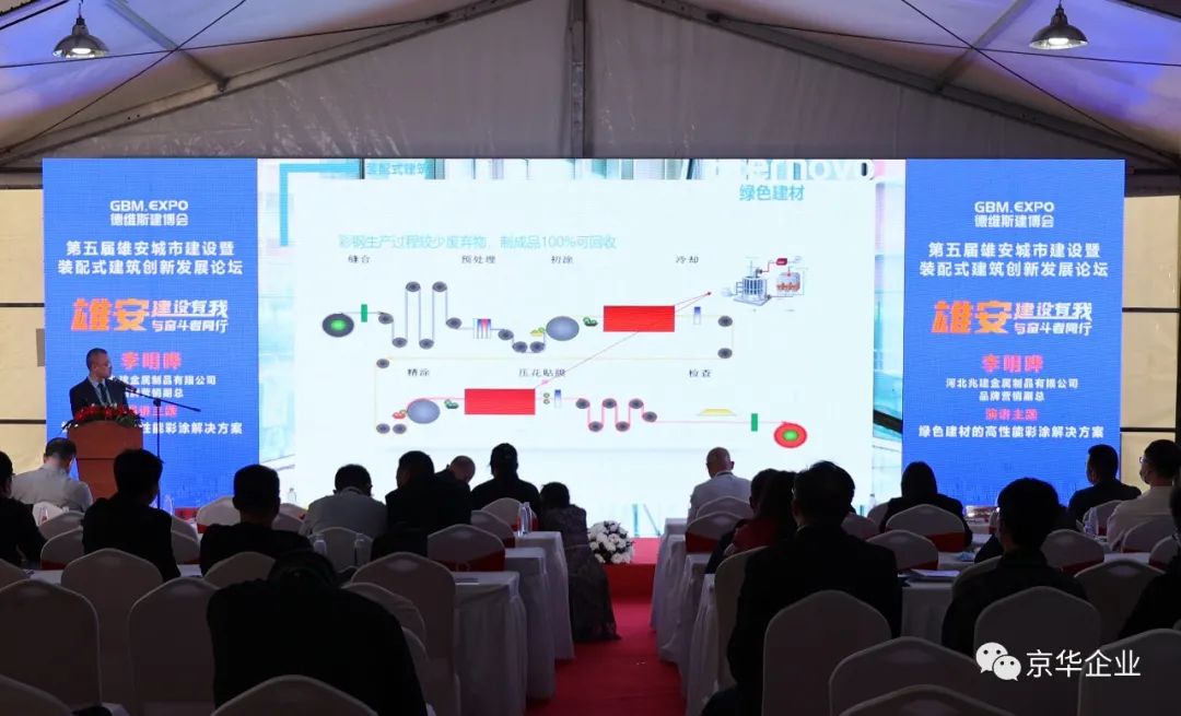 本著拓展視野、開闊思路、學習先進、交流合作的目的,京華兆建應邀參加此次會議并推出《綠色建材的高性能彩涂解決方案》。京華兆建旗下Eternovo恒新品牌營銷副總李明曄先生針對裝配式建筑這一課題發表了精彩演講同時對Eternovo恒新功能性彩涂板的介紹以及對京華兆建企業文化的宣導也得到了參會觀眾的認可與肯定。