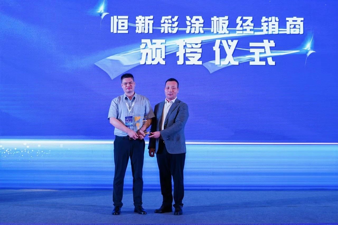 在恒新彩涂板經銷商授權儀式上,京華兆建公司總經理陳鐵柱先生向聯(lián)合舉辦方佛山市常松鋼材貿易有限公司總經理戴清洪先生頒發(fā)了授權牌,并同與會嘉賓上臺合影留念,在現場嘉賓的共同見證下開啟深度友好合作新篇章!